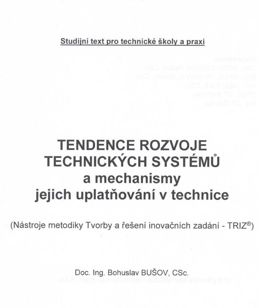 Text poslouží i lektorům a studentům kurzu Tvorba a řešení inovačních zadání – TRIZ jako doplňkový materiál, protože ZRTS a mechanismy jejich uplatňování v technice jsou významnou částí analyticko syntetické a dialektické metodiky TRIZ. Doc. Ing. Bohuslav Bušov, CSc.